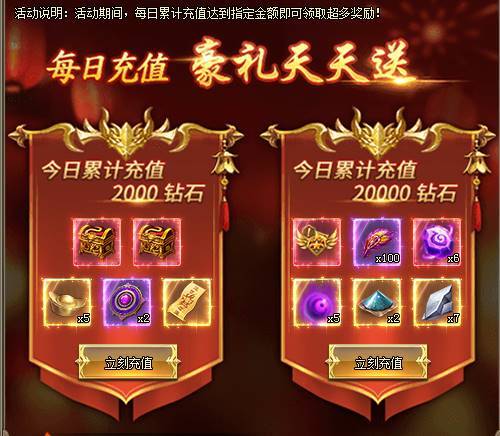 1、活动期间,每日累计充值达到指定金额即可领取超多奖励。[游戏内显示为准,开服7天后开启]