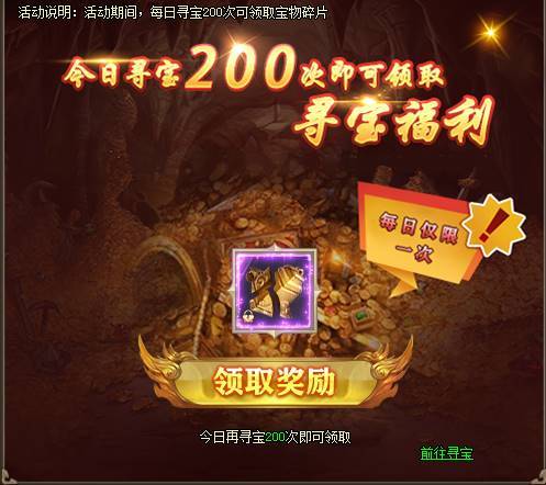 1、活动期间,每日寻宝200次可领取宝物碎片。[游戏内显示为准,开服7天后开启]