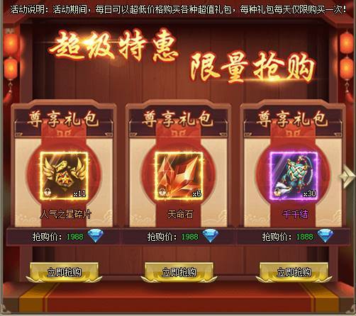 1、活动期间,每日可以超低价格购买各种超值礼包,每种礼包每天仅限购1次。[游戏内显示为准,开服7天后开启]