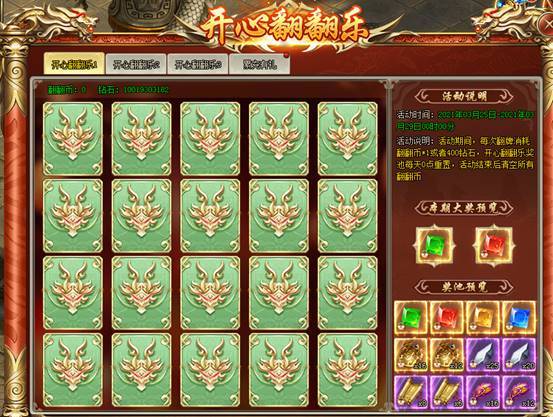 1、活动期间,每次翻牌消耗翻翻币*1或者400钻石,开心翻翻乐奖池每天0点重置,活动结束后清空所有翻翻币![游戏内显示为准]