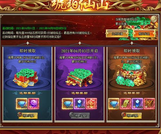 1、活动期间,每充值3888钻石即可获得1份琥珀仙玉,最高持有200琥珀仙玉。达到指定要求仙玉数量和时间要求可领取奖励![游戏内显示为准,开服7天后开启]