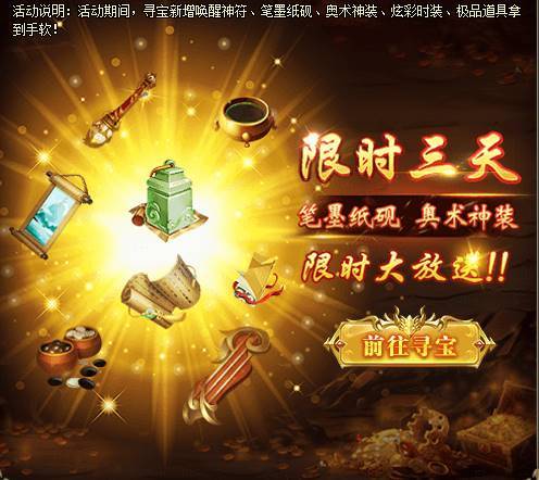 1、活动期间,寻宝新增唤醒神符、笔墨纸砚,极品道具拿到手软。[游戏内显示为准,开服7天后开启]