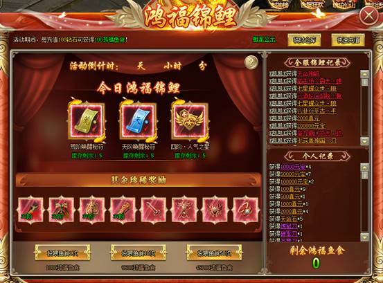 1、活动期间,每充值100钻石可获得100鸿福鱼食![游戏内显示为准]
