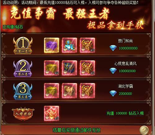1、活动期间,最低充值100000钻石可入榜。入榜可参与排行榜争夺,获取超级奖励,奖励在活动结算后通过邮件发放。[游戏内显示为准,开服7天后开启]