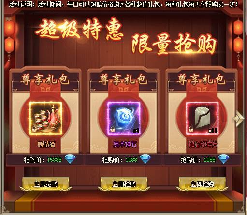 1、活动期间,每日可以超低价格购买各种超值礼包,每种礼包每天仅限购1次。[游戏内显示为准]