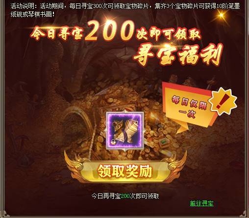 1、活动期间,每日寻宝300次可领取宝物碎片,集齐3个宝物碎片可获得10阶笔墨纸砚或琴棋书画。[游戏内显示为准]