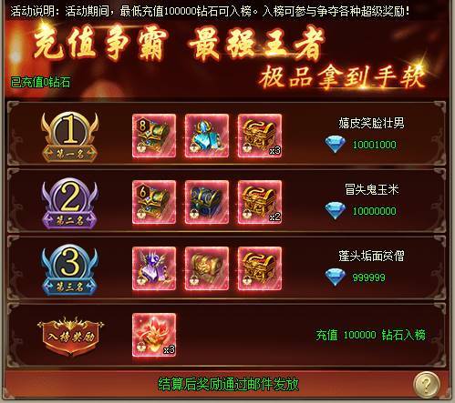1、活动期间,最低充值100000钻石可入榜。入榜可参与排行榜争夺,获取超级奖励,奖励在活动结算后通过邮件发放。[游戏内显示为准]