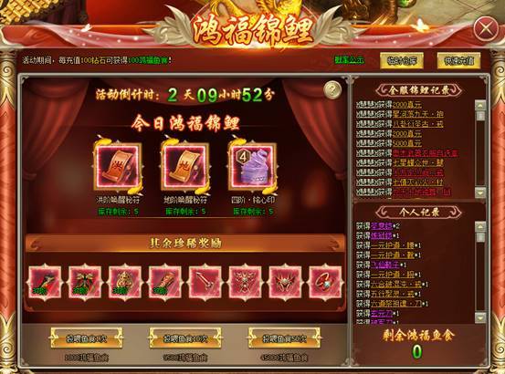 1、活动期间,每充值100钻石可获得100鸿福鱼食![游戏内显示为准]