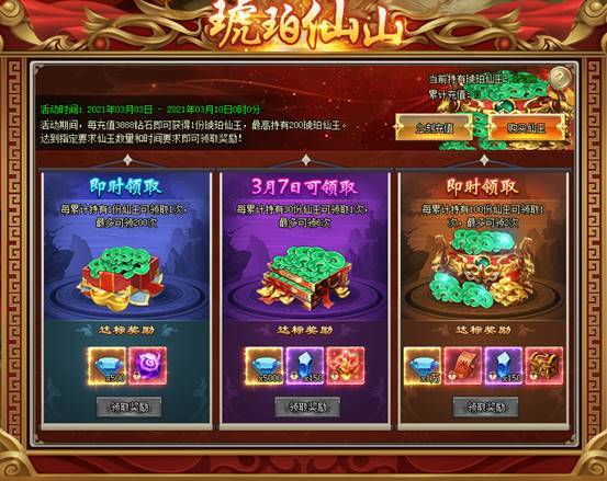 1、活动期间,每充值3888钻石即可获得1份琥珀仙玉,最高持有200琥珀仙玉。达到指定要求仙玉数量和时间要求可领取奖励![游戏内显示为准]
