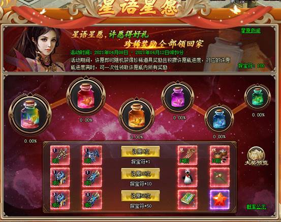 1、活动期间,许愿即可获得珍稀道具奖励且积攒许愿瓶进度,对应许愿瓶进度满时可一次领取许愿瓶内所有奖励![游戏内显示为准,开服7天后开启]