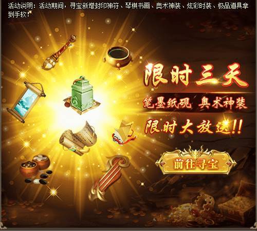 1、活动期间,寻宝新增封印神符、琴棋书画,极品道具拿到手软。[游戏内显示为准,开服7天后开启]