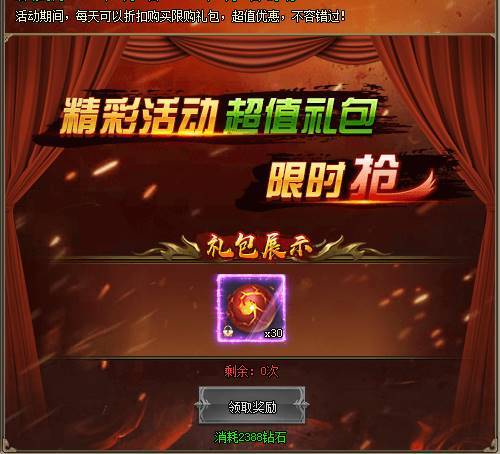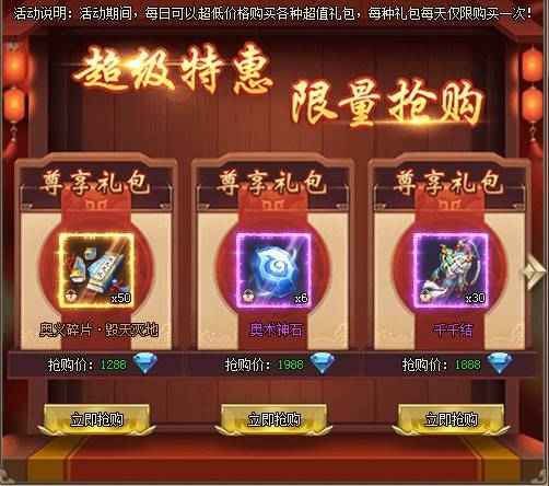 1、活动期间,每日可以超低价格购买各种超值礼包,每种礼包每天仅限购1次。[游戏内显示为准,开服7天后开启]
