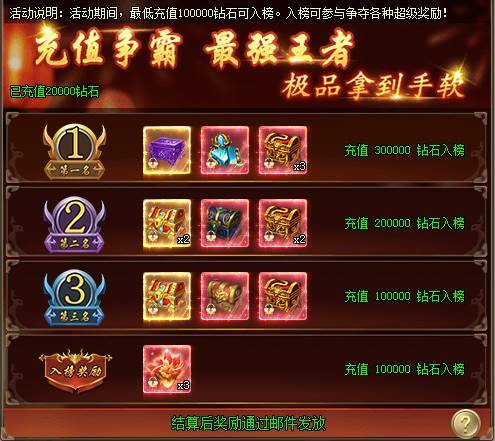 1、活动期间,最低充值100000钻石可入榜。入榜可参与排行榜争夺,获取超级奖励,奖励在活动结算后通过邮件发放。[游戏内显示为准,开服7天后开启]