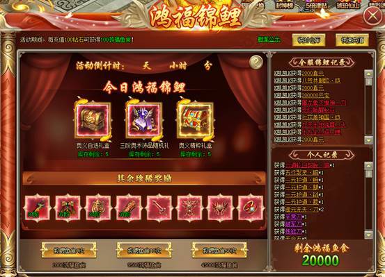 1、活动期间,每充值100钻石可获得100鸿福鱼食![游戏内显示为准]