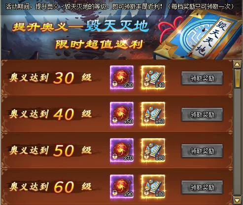 1、活动期间,提升奥义·毁天灭地的等级即可领取丰厚返利![游戏内显示为准]