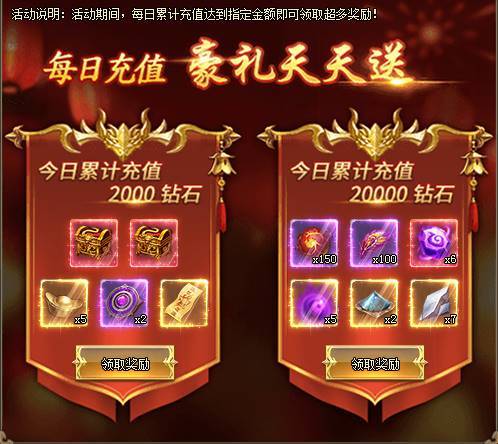 1、活动期间,每日累计充值达到指定金额即可领取超多奖励。[游戏内显示为准,开服7天后开启]